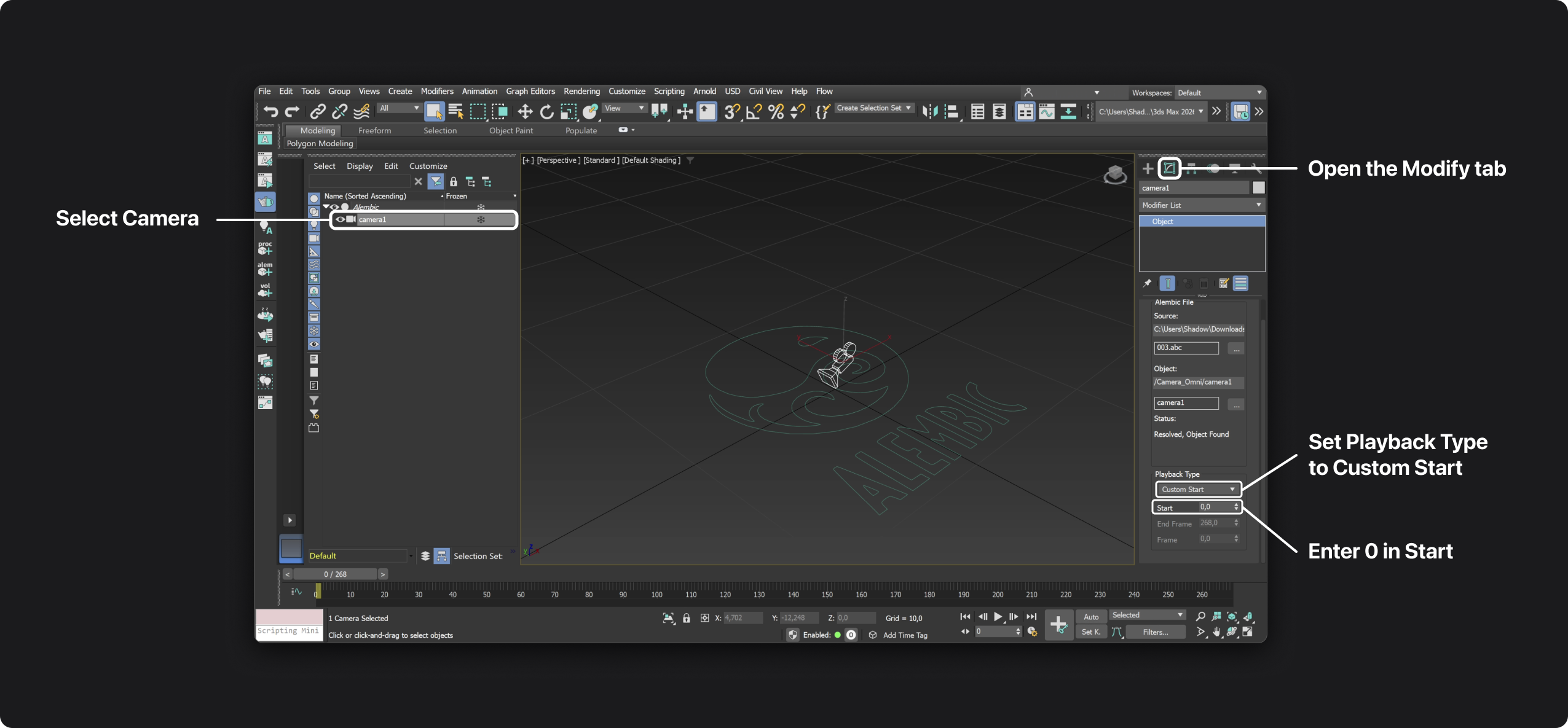 Camera jittering: If the Alembic camera jitters even with matching FPS, select the imported camera, open its properties in the Modify panel, set Playback type to Custom Start, and enter 0 as Start time. This forces the Alembic playback to start on frame zero and removes the offset that causes jitter.